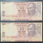 RS10 SIGNED YV REDDY ERROR BANKNOTE WITH MASSIVE CUTTING ERROR AND SERIAL NUMBER MISPLACED AND MISMATCH ALL 4 SERIAL NUMBER ARE DIFFERENT VERY RARE AND UNIQUE ERROR |