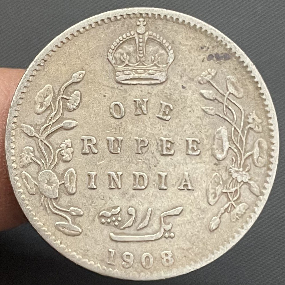 1908 (8 over 7)British India 1 Rupee Re 1908 King Edward VII Bombay Mint Coin with B Incuse and Dot traces of 7 seen behind last numeral 8 very rare