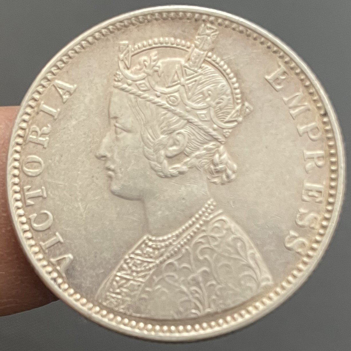 British India 1 Rupee – Victoria Empress 1890 Silver Coin Bombay Mint B Incused at top flower